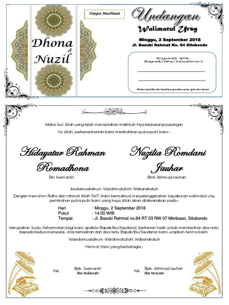 Undangan pernikahan islami biasanya diawali dengan bacaan basmallah dan salam yaitu assalamu’alaikum warahamtullahi wabarokatuh yang ditulis menggunakan huruf hijaiyyah. Yang terkhir yaitu undang dengan format cdr dimana kalian bisa edit di coreldraw namun tentunya download disini terlebih dahulu filenya. Assalamualaikum warahmatullahi wabarakatuh pada kesempatan kali ini saya mau berbagi sebuah template undangan pernikahan word jadi anda bis. 1 29 2021 download undangan pernikahan word yang bisa diedit berbagai warna 2021 sebelumnya kami pernah membagikan desain undangan pernikahan cdr psd dll gratis ternyata cukup banyak orang yang menginginkan template undangan perkawinan dalam format microsoft word. Berikut beberapa format undangan berdasarkan lokasi pesta, bahasa, dan adat.