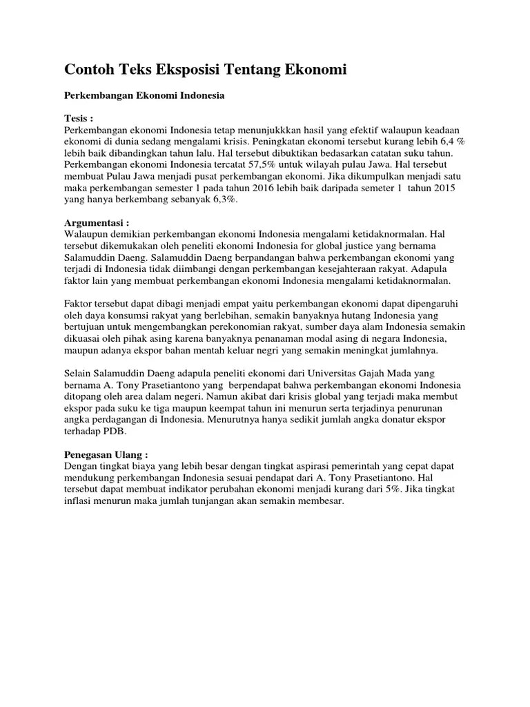 Teks eksposisi tentang ekonomiekonomi indonesia a. Produk domestik bruto (pdb) dari civets itu diperkirakan berkontribusi sekitar setengah dari ekonomi global pada 2020. Contoh teks eksposisi tentang ekonomi. Lingkungan yang bersih adalah satu diantara prasyarat untuk mendukung kehidupan yang sehat, baik … 05/11/2016 · berikut adalah contoh teks eksposisi tentang ekonomi :